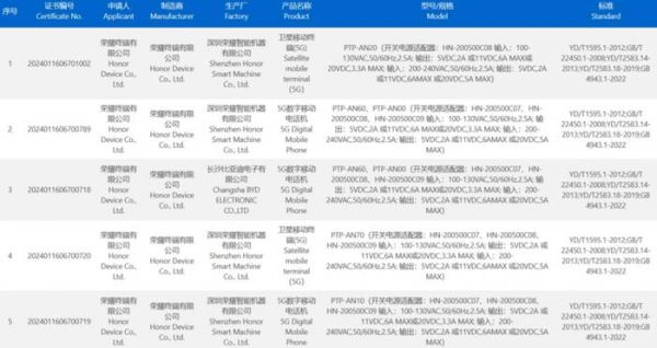 认证信息显示,这五款新机均支持100W快充,其中的两款机型支持卫星通信功能,相关推测认为是荣耀Magic7系列。