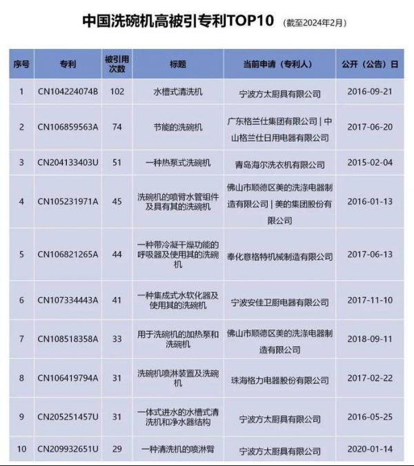 截止到2024年2月,方太在洗碗机领域拥有的授权专利数达到1338件,其中在最为核心的洗碗机清洗功效相关领域,方太的授权专利量高达790件。