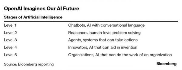 △来源:彭博OpenAI 将 AGI(通用人工智能)的发展阶段划分了 L1-L5 的等级。按照这个分类,如今业界普遍认为,我们处于 L2(推理者)的早期发展阶段。
