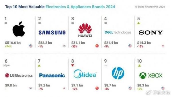不久前,品牌评估机构Brand Finance公布了“2024全球电子与家电品牌价值榜单”,这一榜单不仅反映了当前电子与家电行业的竞争格局,还预示着未来市场的趋势和动向。榜单前十名中,美国占4个、日本占2个、韩国占2个、中国占2个。