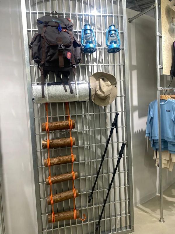 为了契合美邦现在主打的户外概念,门店售卖的主要商品有冲锋衣、工装裤等户外类型服饰,同时,店里塑造了不同的户外场景架。一面墙上是各种登山用具,登山包,登山杖、登山水壶等等;另一面墙则是木头、斧头等野外木材,构建起模拟的山林生态。