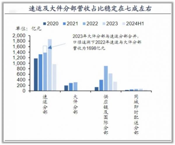 2023年速运及大件分部实现营收同比增加484.8亿元,净利润同比增加29.9亿元,净利率为4.5%,其中时效快递业务贡献了97.6亿元的营收增量,占比超过一半。