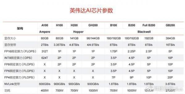 先说说英伟达的AI芯片水平,下图是英伟达主流AI芯片的参数情况,从A100,到H100,H200,GH200、B100、B200、GB200等。