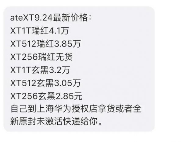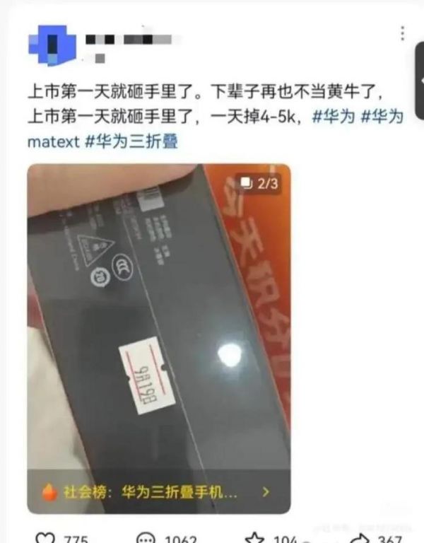 但是这个价格仅维持了一天时间。有网友发帖称,9月21日,自己抢到的黑色Mate XT手机以3万元的价格卖掉。另外,还有网友称,在9月21日晚上,Mate XT价格最低已经来到了2.7万元。