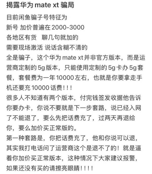 “他们都会开出一个较低的溢价,然后在付完钱后,告诉你买的是5g定制版本。”9月23日,在南京读研的小夏通过闲鱼平台联系上了一名黄牛,打算购买一台黑色1TB的Mate XT,对方仅加价2000元,在经过简单的沟通后,对方要求他加微信,并给他发送了门店的地址。