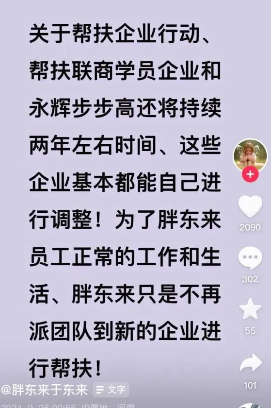 9月26日凌晨,于东来在社交媒体回应表示:“关于帮扶企业行动、帮扶联商学员和永辉步步高还将持续两年左右时间、这些企业基本都能自己进行调整!为了胖东来员工正常的工作和生活、胖东来只是不再派团队到新的企业进行帮扶!”