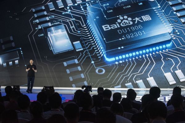 百度首席技术官王海峰今年7月在公司的开发者大会上发表讲话。