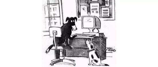 画面上一条狗坐在电脑前,对着同伴说:“在互联网,没人知道你是一条狗。”