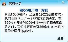 腾讯针对这一系列事件发布了《致QQ用户的一封信》,表示QQ与360不兼容,只能二选一。