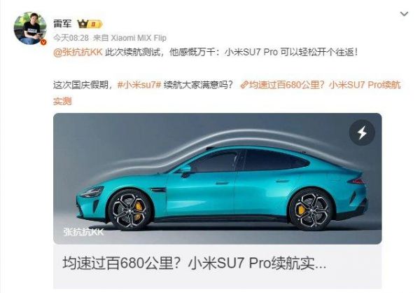 博主实测小米SU7 Pro续航达680公里 雷军点赞转发