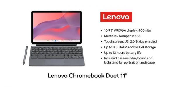 紧凑耐用的 Lenovo Chromebook Duet 11” 不仅可以轻松放入您的包中或放在膝盖上,还可以通过内置支架从笔记本电脑模式转换为平板电脑模式。Lenovo USI Pen 2(单独出售)和升级版防手掌误触模式让您可以精确地绘制草图,而联发科 Kompanio 838 处理器配备高达 8GB 的 RAM 和 128GB 的存储空间,可满足您的日常需求。此外,您还可以使用高分辨率 8MP 后置摄像头和 5MP 前置摄像头进行视频通话或录制,并配备新的 AI 增强变焦功能,明亮的窄边框显示屏可帮助您舒适地播放视频。