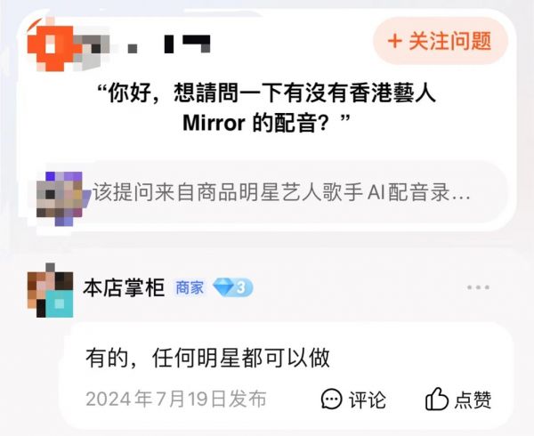此外,已初步形成产业链的AI服务,还有有关名人明星的AI定制婚礼祝福录制视频,价格在几元到上百元不等。对于此类服务,有用户在商品评价中这样写道,“出片速度很快,效果很逼真”,也有商家在客户问答中这样留言,“任何明星都能做”。