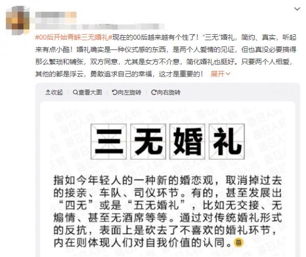 “年轻人在结一种很实在的婚”“‘00后’开始青睐‘三无婚礼’”“‘三无婚礼’简约不简单”“在结婚这件事上年轻人越来越野了”等话题热度不断攀升,显示出年轻人对婚礼的追求越来越偏向于注重内心的感受。而当年轻一代对于婚礼的期待逐渐超出传统的框架,个性化、多元化、轻量化、精细化的创意婚礼则成为一股不可忽视的新风尚。