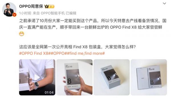 今天,OPPO Find 系列产品负责人周意保发布最新的预热消息称:“之前承诺了10月份大家一定能买到这个产品,所以今天特意去产线看备货情况,国庆一直满产能在生产,顺手带回来一台新鲜出炉的 OPPO Find X8 给大家尝尝鲜这应该是全网第一次公开亮相 Find X8 包装盒,大家觉得怎么样?”