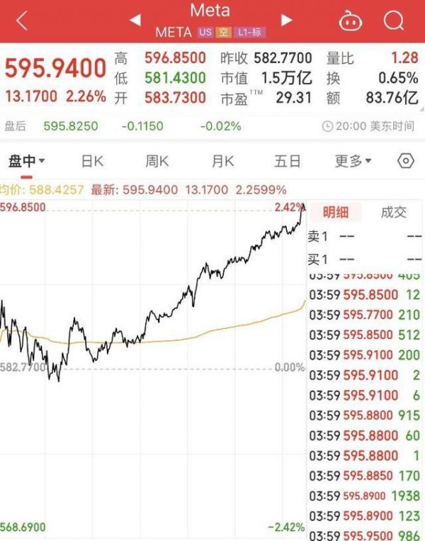 受此利好消息影响,美东时间10月4日周五,Meta公司股价高开高走,股价最高升至596.85美元,创历史新高;收盘时涨2.26%,股价创595.94美元的收盘历史新高;最新总市值为1.5万亿美元。