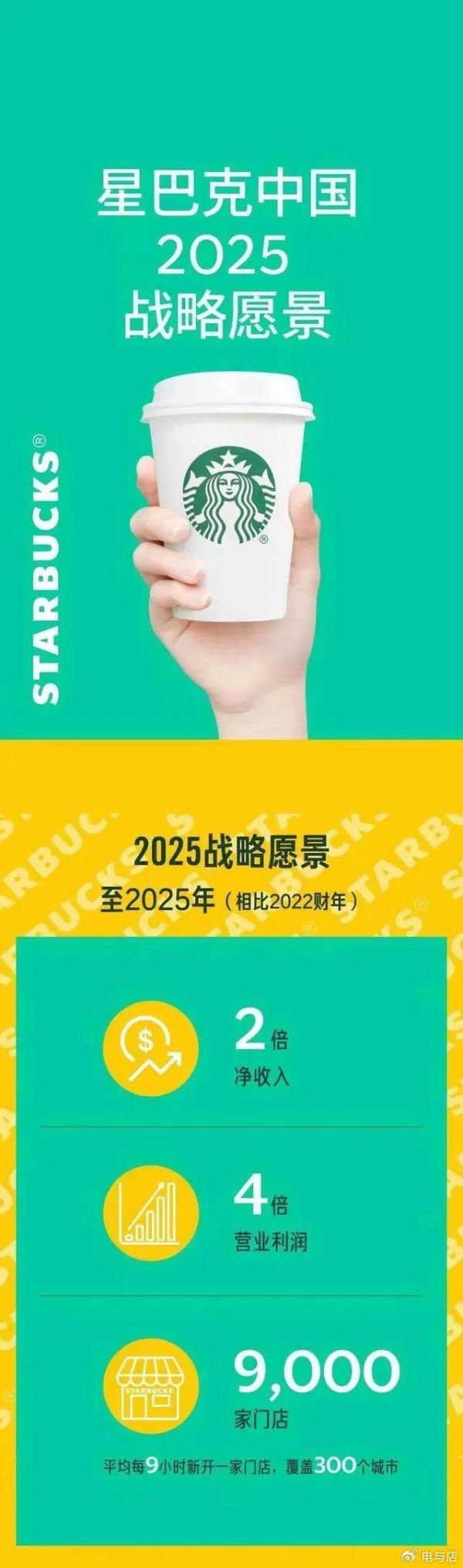 看起来星巴克在中国的开店速度已经非常快,其实距离其本来的目标仍有距离。因为据《电与店》了解,早在两年前的2022年9月,在星巴克中国提出的未来三年战略愿景中其就曾发布“2025愿景”,即计划到2025年在300个城市经营9000家门店,即平均每9小时开出一家新门店,同时每年创造超过10000个工作岗位。