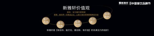 一直以来,新雅轩秉承“客户天大”价值观,以“为客户直接价值增值”为出发点,去支撑我们的客户。新雅轩的使命是“旨为餐饮更简单”,愿景是“做世界一流食品企业,让奋斗者实现物质精神双丰收”。