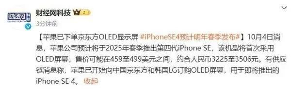 今年iPhone SE4将首次用上OLED屏。据爆料,SE4的OLED面板将由国产供应商京东方(BOE)提供,有消息称目前苹果已开始向京东方和LG订购OLED屏幕。