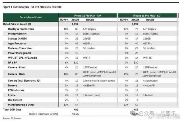 另外,近日市场调查机构 TD Cowen 还对于 256GB版本的 iPhone 16 Pro Max 进行了物料成本分析,认为其包括零部件、产品组装以及包装等在内的整个物料清单(BOM)成本约为 485 美元,相比上代的iPhone 15 Pro Max(453美元)成本高出了约7%,即32美元。