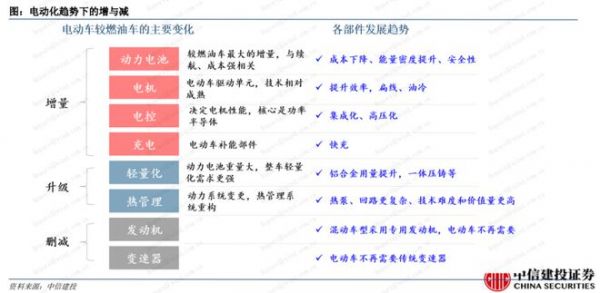 相比于燃油车,电动化带来了全新的零部件增量以及技术升级。比方说,电动化下动力总成的改变创造了电池、电机电控等产品的出现,同时续航里程的提升以及安全性的考虑,要求轻量化、热管理等配套零部件的升级支持。