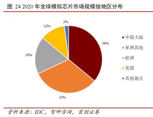 首先,从空间上来看,随着经济的不断发展,我国已经成为了全球最大的电子产品市场,并由此衍生出了巨大的芯片需求,具体到模拟芯片的话,我们可以参考IDC的数据,那就是中国大陆占全球市场的比重,已经高达36%。