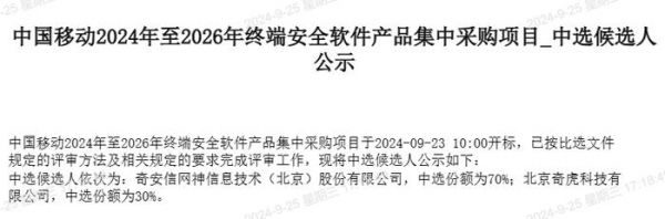 9月24日,中标候选人公示,奇安信网神信息技术(北京)股份有限公司中选70%的份额,剩下30%的份额被北京奇虎科技有限公司收入囊中。