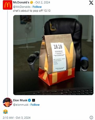 另外,特斯拉或将与麦当劳合作,利用Robotaxi送外卖。的依据是,麦当劳上周发布一条帖子称,“聊天将于10.10开始。”马斯克用笑哭表情符号回复。