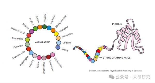 这是一张教育性很强的示意图,清晰地展示了从基本构建块(氨基酸)到最终产物(蛋白质)的概念。