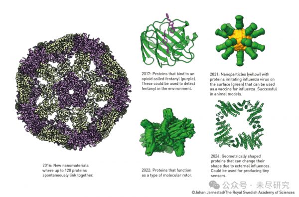 这张图展示了David Baker团队在设计人工蛋白质方面的一些重要成果时间线: