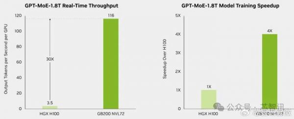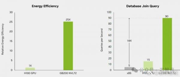 与英伟达 H100 Tensor Core GPU 相比,GB200 NVL72 可以提供 30 倍的 LLM 推理、4 倍的 LLM 训练和 18 倍的 CPU 数据处理能力,综合能效达到了H100 的 25 倍。