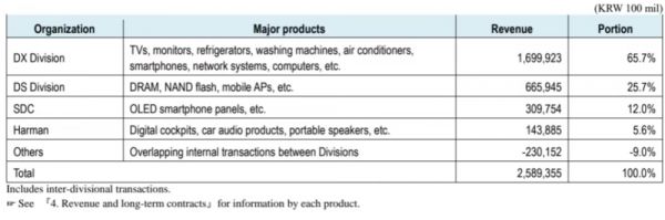 在三星电子的业务结构中,以TV电视、冰箱、洗衣机、智能手机及电脑等消费电子及家电产品组成的DX事业部,和以DRAM、NAND闪存、移动AP等组成的DS事业部,是公司最大的两大业务板块。据三星电子2023年披露报告,DX、DS两大事业部分别贡献了三星电子65.7%和25.7%的收入。