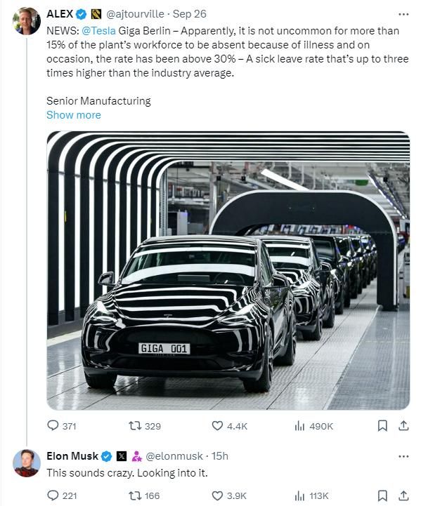 最近,特斯拉柏林工厂的高缺勤率,引起了马斯克的注意。