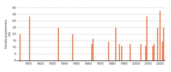 与此相对照的是,负责评选诺贝尔奖的组织表示过,他们正在积极努力提升诺贝尔奖得主的多样性,并且已经取得了显著进展。整个 20 世纪,诺贝尔化学奖、物理学奖以及生理学或医学奖仅有 11 次被授予女性;而在 2000 年至 2023 年间,这个数字就提升到了 15 次。