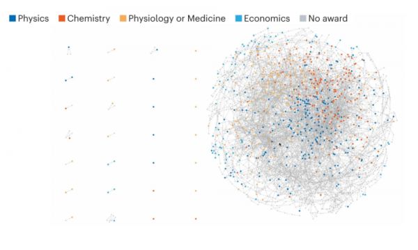 在更隐秘的角落,诺贝尔奖之上还笼罩着一层巨大而无形的“人情网”。Nature 的调查显示,无论看起来有多离谱,几乎所有诺贝尔奖得主都存在某种联系。令人惊讶的是,获得科学类以及经济学奖项中的 736 位得主中,有 702 位属于同一个学术家族——他们通过学术关系在历史的某个节点彼此相连。
