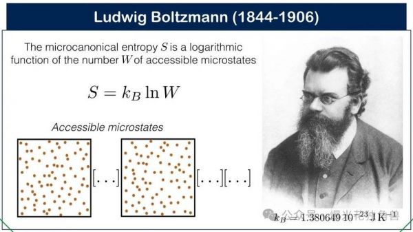 其中,S 是熵, kB 是玻尔兹曼常数,W 是对应于系统能量的微观状态数(Boltzmann, 1877)。这一公式至今仍是统计物理学的核心内容。