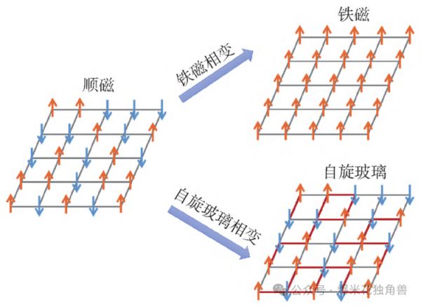 而在自旋玻璃模型中, 是随机变量,可以取正值(表示自旋相互吸引)或负值(表示自旋相互排斥)。这种随机性导致系统中的自旋难以同时满足所有相互作用,使得找到最低能量状态变得极为困难,这种现象被称为阻挫(frustration)(Binder & Young, 1986)。