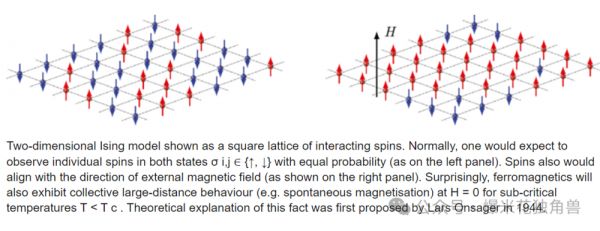 最初,伊辛对一维模型的研究结果显示该模型不存在相变现象,这一发现导致该模型未能引起物理学界的广泛关注(Brush, 1967)。然而,这种状况在1944年发生了改变,著名统计物理学家拉斯·昂萨格(LarsOnsager,1968年诺贝尔化学奖得主)对二维伊辛模型进行了精确求解,发现了其中的相变现象(Onsager, 1944)。这一成果被视为解决相变问题的里程碑。