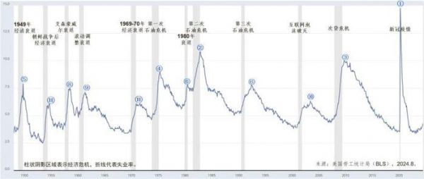 失业率和经济衰退紧密相关,是一枚硬币的两面。美国失业率最高达到24.9%,出现在史上最严重的一次经济危机——1933年大萧条。自1948年劳工统计局(BLS)开始发布月度就业数据以来,美国共有12次失业率高峰和12次经济危机,两者一一对应。失业率是经济活动的滞后指标,失业率高峰往往发生在经济危机结束后的几个月。如下图所示。