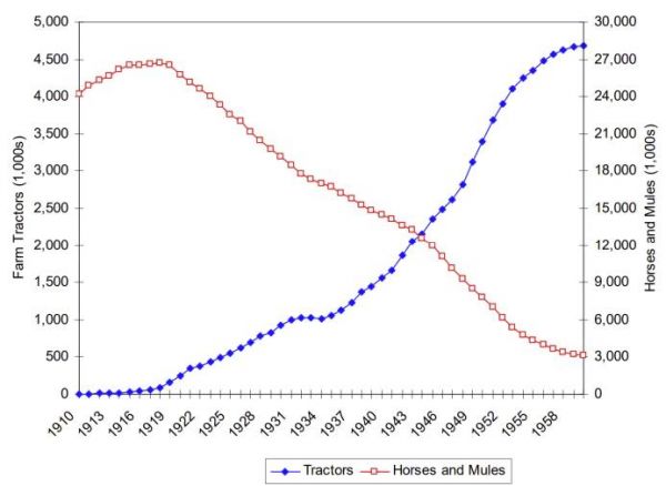 图1910-1960年美国农场拖拉机对马匹和骡子的取代来源:Historical Statistics of the United States,Series K184,K570,K572.