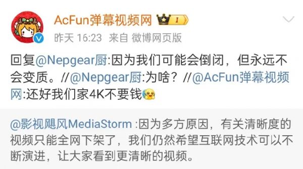 于是不止网友们义愤填膺的转发补档,激烈讨论,不少大 v 也下场分析,痛陈利弊,长呼一声 “ 唉,资本 ” ;甚至连 AcFun 官微也跑来狠狠阴阳了一波,有复活卡就是硬气。