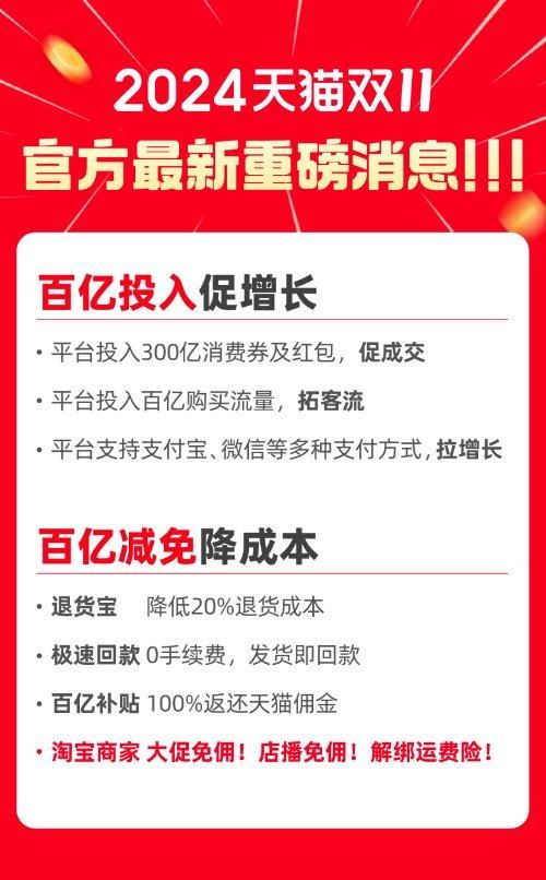 当时,淘宝表示将增投300亿消费券及红包促进成交;斥资百亿购买流量,助力商家全网触达;支持支付宝、微信等多支付方式,拉动商家增长;投入百亿资金,全面降低商家经营成本,涵盖“先用后付”免服务费、“退货宝”再降价、“百亿补贴”全面降低成本、大促免佣、店播免佣等多项权益。