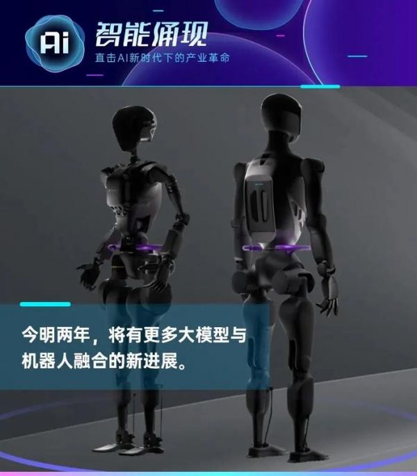 现在通过大模型,一个神经网络就可以控制人形机器人,而且机器人的动作可以产生一些意想不到的东西,因为是它自学的。你给它做了一些示范,它可以模仿学习,你给了它一些奖励函数,它可以通过强化学习快速反应。通过大模型直接给它一张图片,可以让它根据图片阐释下一个坐标的动作。目前,这些分块已经有非常顶尖的大佬和实验室研究。我们觉得大模型与机器人融合在今明两年能够看到更多进展。