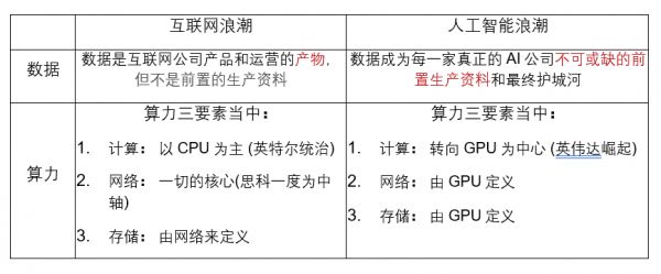 这两个AI产业化阶段的最根本点是:第一次制造了对于数据和算力的充分应用和依赖。针对这一点,我们快速对比一下互联网和AI这两次大的浪潮: