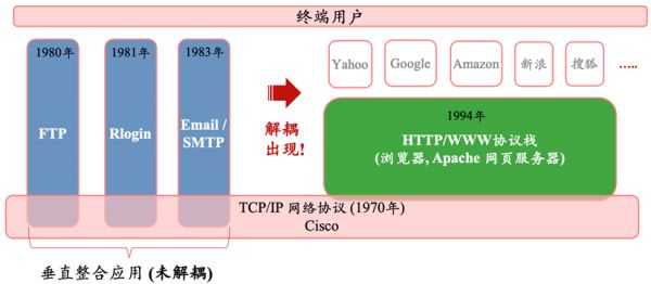 为进一步思考上文提及的技术栈无法解耦和分工的根本现象,我们再回顾一下互联网的历史。我们比较习惯提的互联网,事实上是从1994年浏览器的出现开始的“Web互联网”,而广义的互联网早在1970到80年代就已经出现,最早的形态是FTP、Rlogin、Telnet以及Email电邮等“垂直整合应用”的产品形态。直到Web和浏览器作为平台(下图中的绿色框)出现之后,大量类似Yahoo等基于网页形式的纯应用才真正与底层解耦,从而相继在各个垂直行业爆发,如零售行业的Amazon、旅游行业的Expedia、媒体行业的Netflix等等。