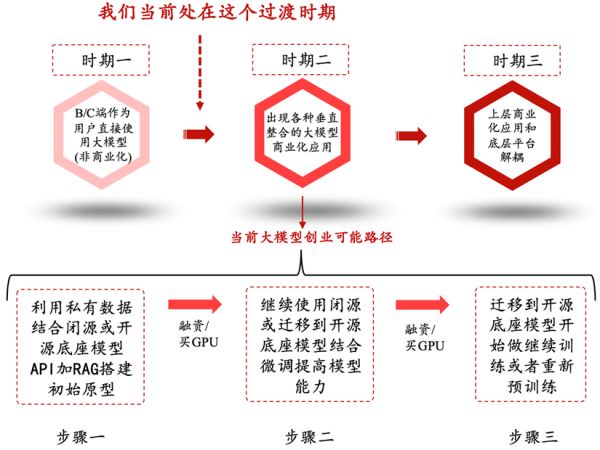 总结上文提到的大模型商业化的三个时期及当前可能的三个发展步骤如下图,上述所有这些中美的“垂直整合应用”公司也都各自处于三个步骤的不同时间点。