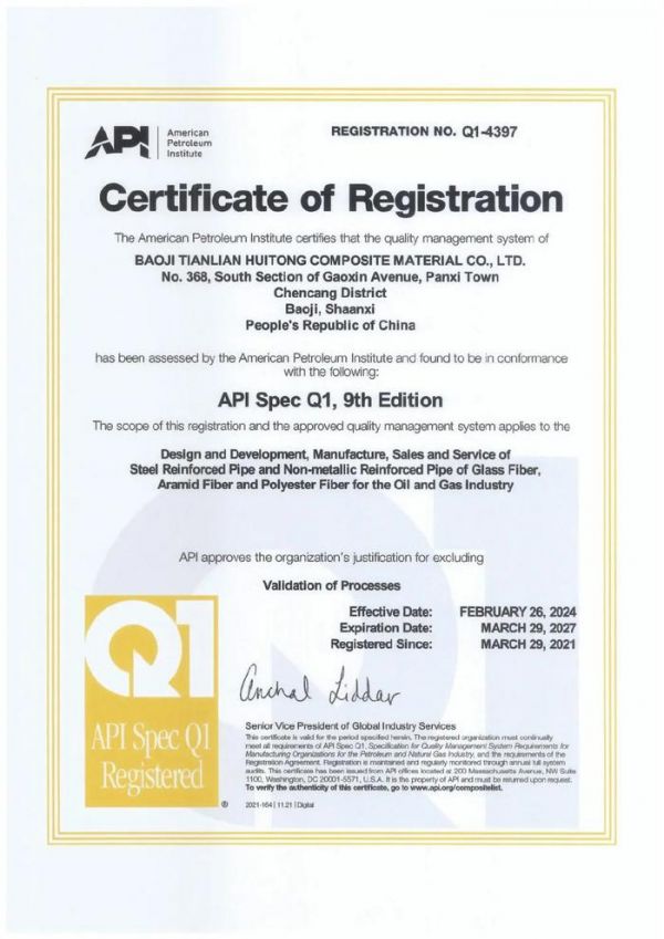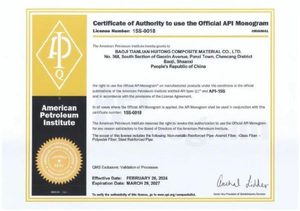 截至目前,公司已取得特种压力管道元件制造许可证、矿用安全许可证;四大核心产品(涤纶纤维增强RTP/芳纶纤维增强RTP/玻璃纤维增强RTP/钢帘线带增强RTP)均通过美国石油学会API 15S产品认证;获得API QI、ISO9001质量管理体系认证;获得ISO14001环境体系认证、ISO45001职业健康与安全体系认证及HSE体系认证。这不仅是对公司技术实力的认可,也是进入国际市场的通行证。