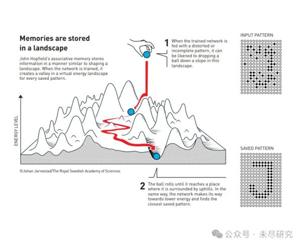 这个模型说明了神经网络如何处理并恢复不完整或扭曲的信息。它将记忆存储比喻为一个能量景观,其中完整的记忆位于能量低谷。当输入不完整信息时,系统会自动“滚落”到最接近的完整记忆状态,从而实现联想记忆和模式识别。