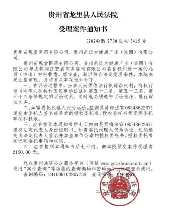 面对刘江的指控,“苗恩通络消痛贴”的厂家贵州苗恩堂医药有限公司和贵州苗氏大健康产业(集团)有限公司,以名誉权纠纷把刘江给起诉了。据“苗恩通络消痛贴”的苗氏旗舰店客服解释,该款产品是由贵州省卫健委审批批准的。