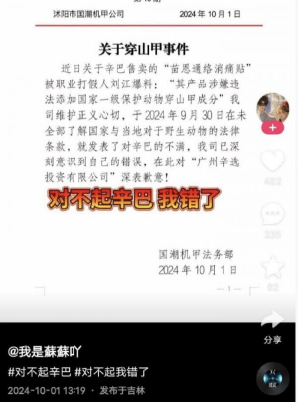 据悉,刘江通过视频和社交平台,详细披露了辛巴及其团队销售的“苗恩消痛贴”中违法添加了穿山甲成分。穿山甲作为国家一级保护动物,其鳞片在传统医学中虽有一定应用,但早在2020年6月5日,国家就已明令禁止将穿山甲入药,即使是养殖的穿山甲也不行。刘江指出,辛巴所售产品中添加穿山甲成分,不仅违反了国家法律法规,更是对濒危物种的严重伤害。