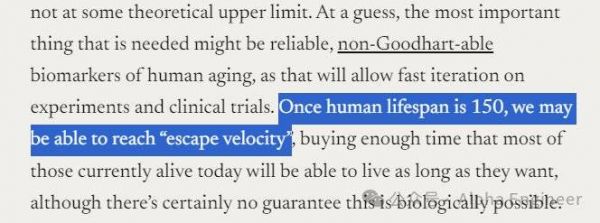 Dario认为AGI有望帮助人类发现某种可靠的人类衰老生物标记物,并在此基础上进行快速迭代和临床试验。一旦人类寿命达到150岁,可能有望达到逃逸速度,为当前大多数活着的人类争取到足够的时间。